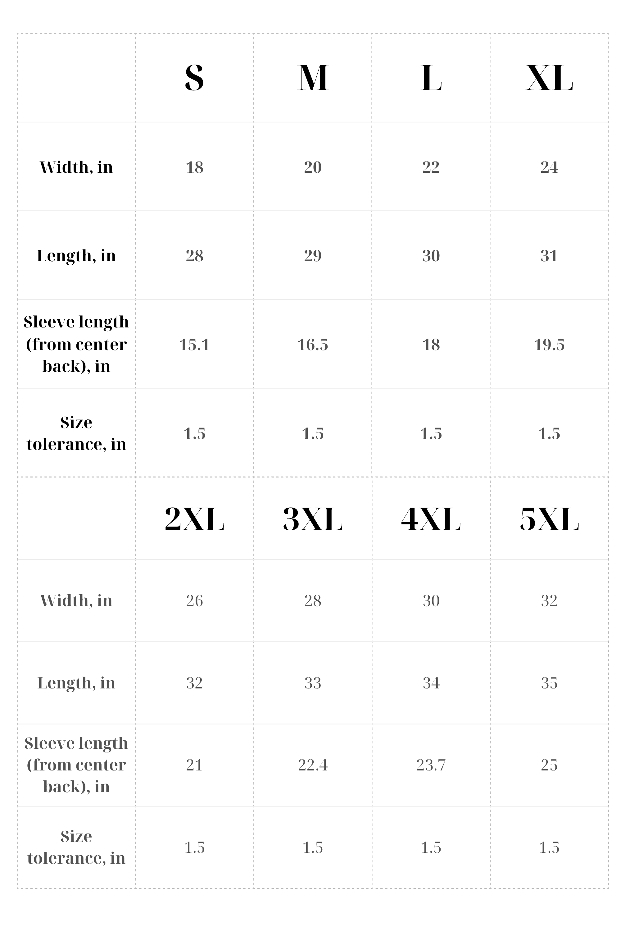 T-SHIRTS SIZE TABLE